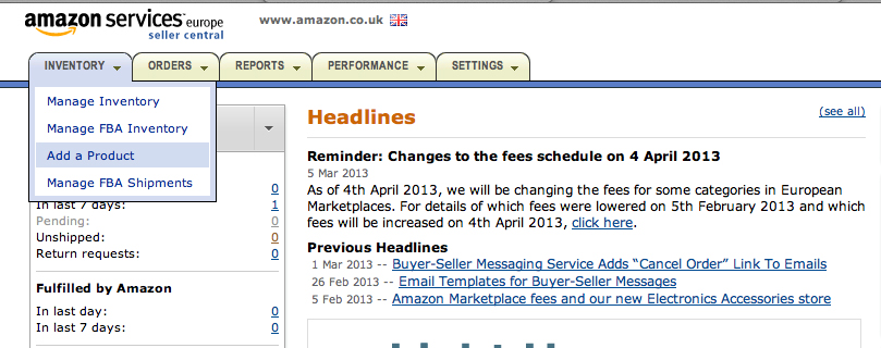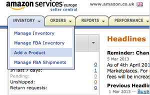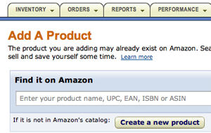 Sign into your Seller Central account. Next click on the inventory tab, select Add a Product from the pull down menu.click to enlarge